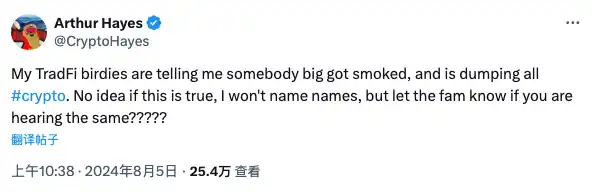 作为比 SBF 更早出现的初代加密之王,BitMEX 联创 Arthur Hayes 在社交媒体上发文表示,通过传统金融领域的渠道,他得知有某个「大玩家」正在清仓加密资产。Arthur Hayes 表示不知道这是不是真的,「我不会说出名字,但如果你也听说了同样的消息,请让大家知道。」