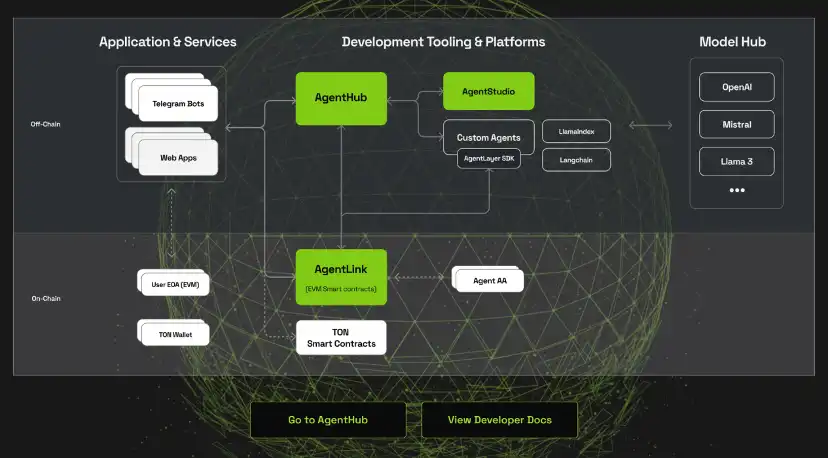 AgentLayer 平台不仅提供了智能合约的链上集成,还支持 Python 和 TypeScript SDK,为开发者提供了灵活的选择,以便将 AI Agent 无缝集成到我们的网络中。此外,AgentLayer 的一大亮点是能够通过 AgentHub 将 AgentStudio 构建的 AI Agent 部署为 Telegram 机器人,这一集成打开了新的可能性,使开发者能够在 Telegram/TON 生态系统中触及更广泛的受众,从而扩展他们的影响力。
