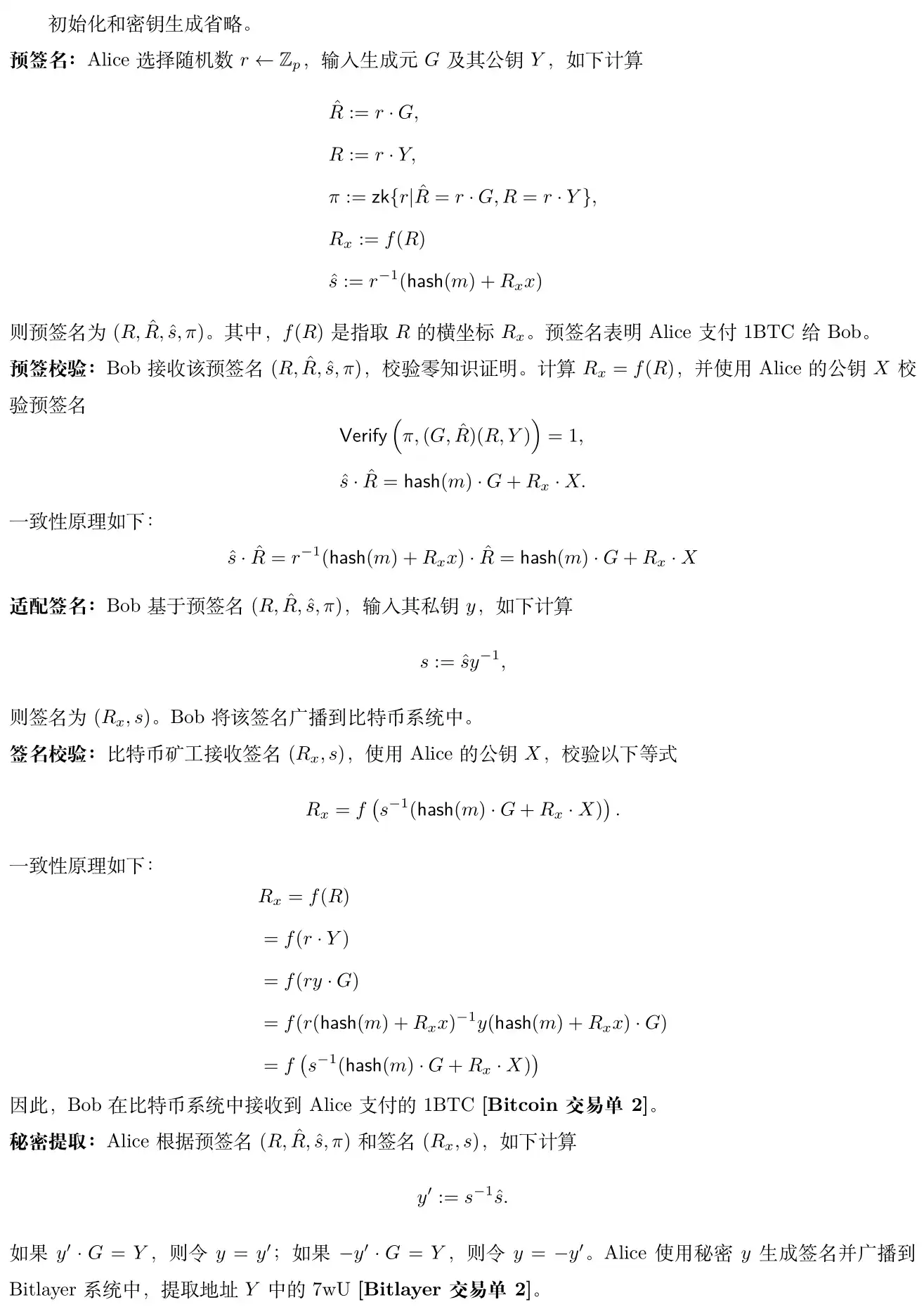 如图 2 所示,假设 Bitcoin 和 Bitlayer 均使用 Secp256k1 曲线,但是 Bitcoin 使用 Schnorr 签名,而 Bitlayer 使用 ECDSA。该情况下,基于 Schnorr 和 ECDSA 的适配器签名,是可证明安全的。假设给定 ECDSA 和 Schnorr 签名预言机,能够构造模拟器 S 攻破 ECDSA,则仅给定 ECDSA 签名预言机,能够构造模拟器 S 攻破 ECDSA。但是,ECDSA 是安全的。同理,假设给定 ECDSA 和 Schnorr 签名预言机,能够构造模拟器 S 攻破 Schnorr 签名,则仅给定 ECDSA 签名预言机,能够构造模拟器 S 攻破 Schnorr 签名。但是,Schnorr 签名是安全的。因此,在跨链场景下,适配器签名使用了相同曲线,但是签名算法不同,则是安全的。换言之,适配器签名允许一端使用 ECDSA,而另一端使用 Schnorr 签名。