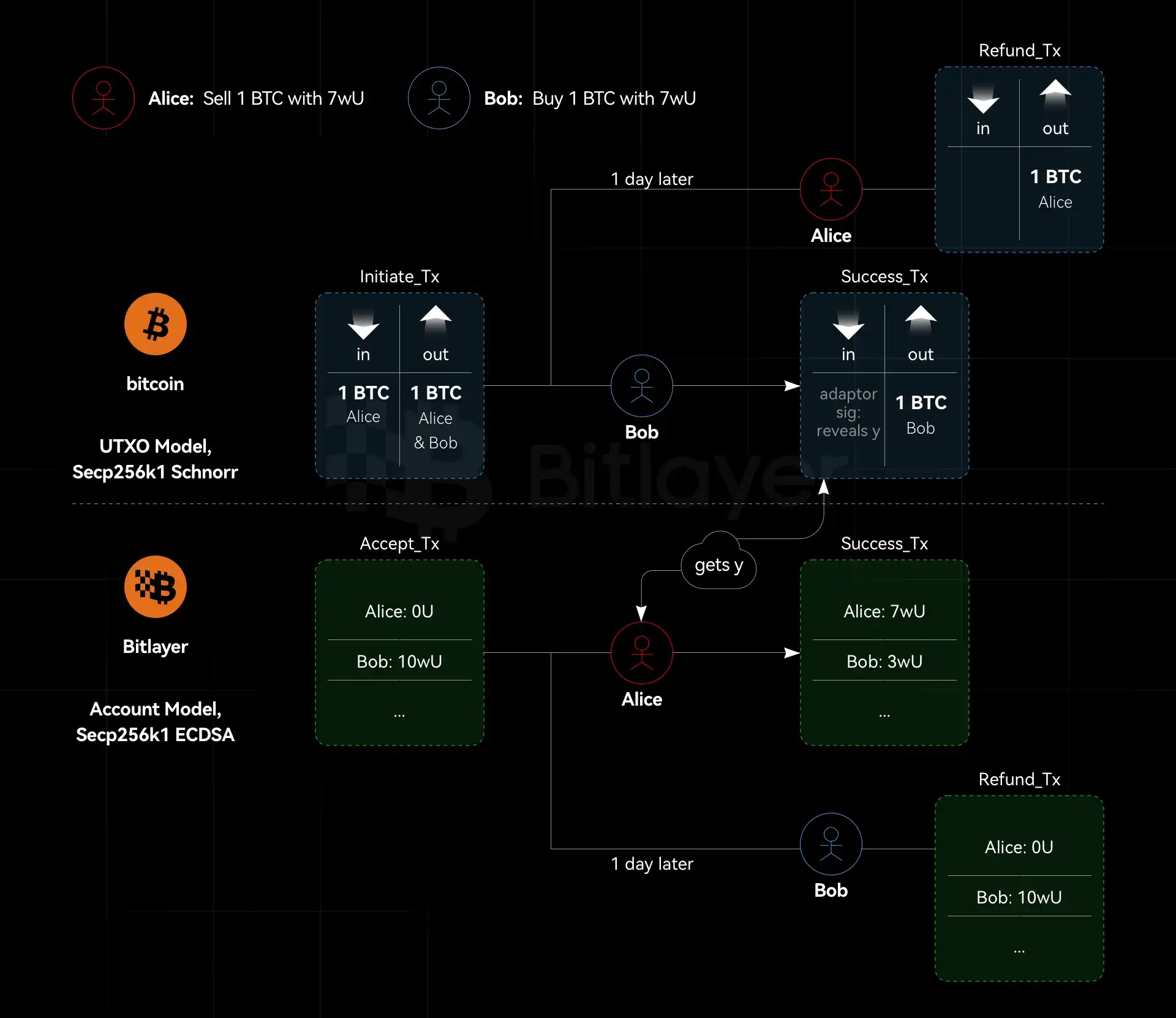Bitlayer 目前支持原生 ECDSA 签名,也可通过智能合约实现 Schnorr 签名验证。如果使用原生的 Bitlayer 交易,则无法预签原子交换中的退款交易;需要使用 Bitlayer 智能合约交易,才能够实现原子交换。但是,该过程会牺牲隐私性,即 Bitlayer 系统中参与原子交换的交易是可追溯的,但无法追溯到 BTC 系统中的交易。在 Bitlayer 端可设计类似 Tornado Cash 之类的 Dapp 应用,为 BTC 与 Bitlayer 原子交换中 Bitlayer 端的交易提供隐私服务。