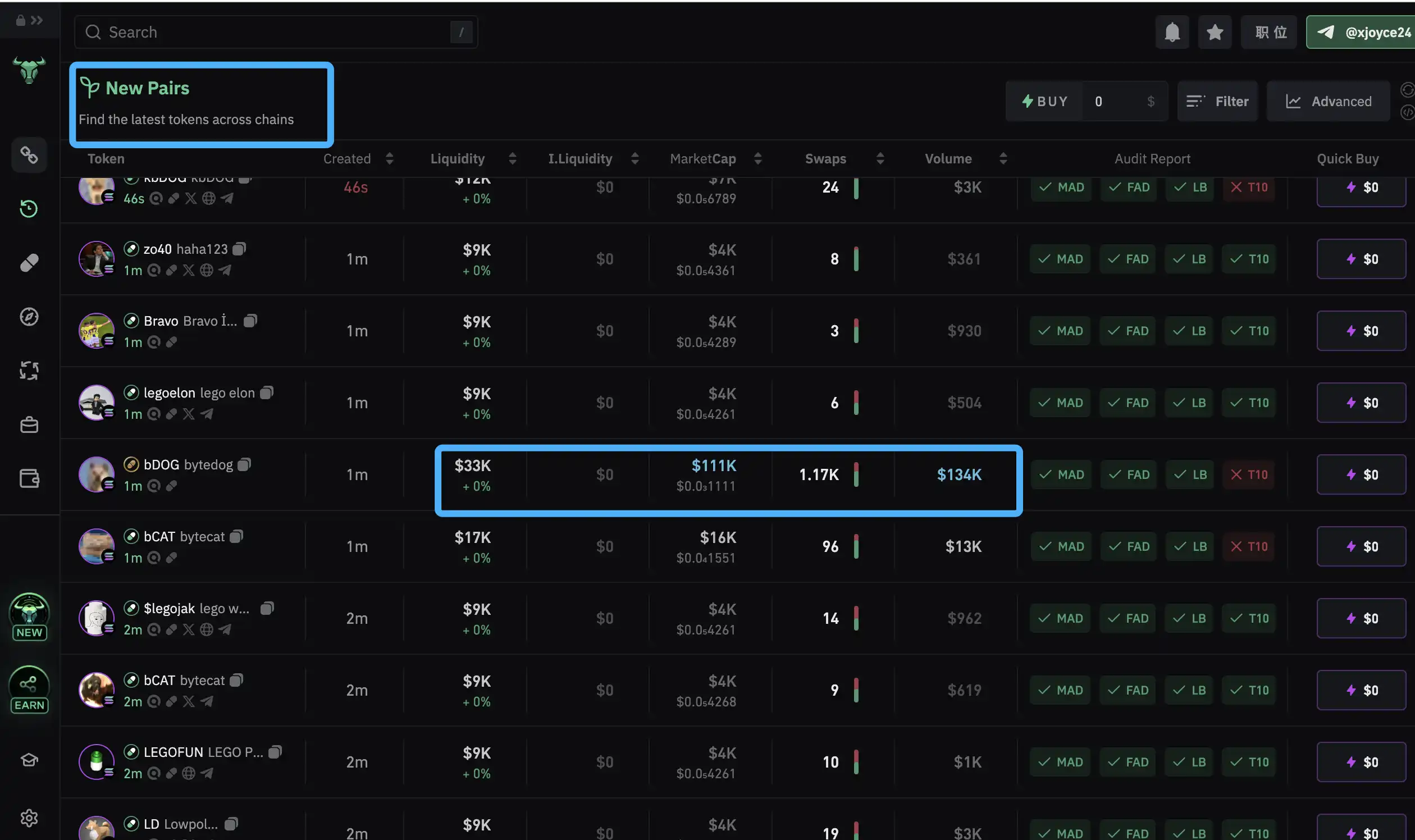 用户可以点击「chain」选择只查看 Solana 和以太坊链的新币动态。点击「New Pairs」,可以显示最新监控上线的 30 个代币,这个页面下最早的代币通常上线于 2 分钟之前。能够查看的指标分别为创建代币时间、代币流动性、市值、交易笔数、交易量和基本的合约安全报告。Bullx 会对异常数据进行高亮显示,以便用户第一时间发现 alpha 新币。