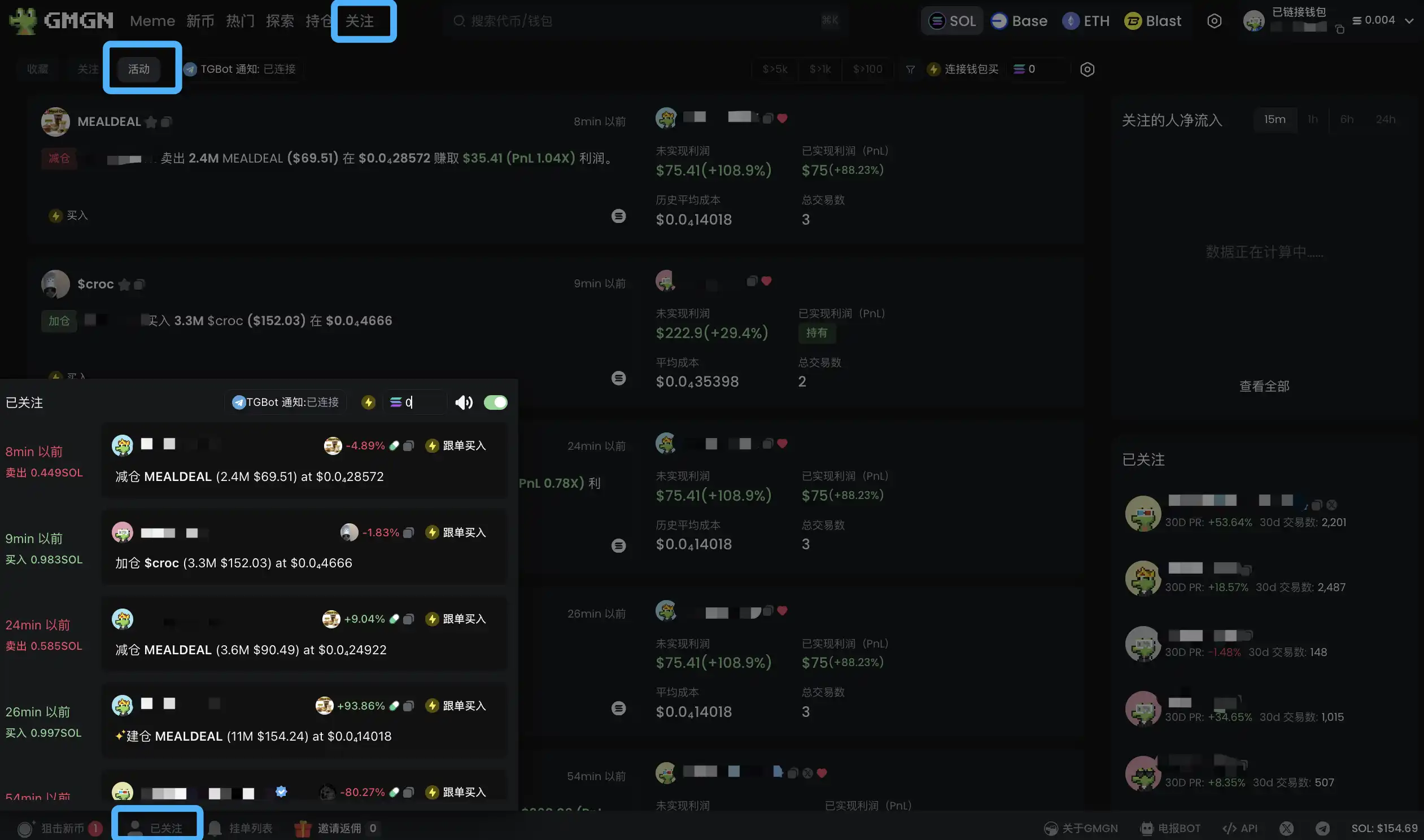 另外,GMGN 在页面左下方也设置了「已关注」专栏让用户第一时间捕获聪明钱动向。