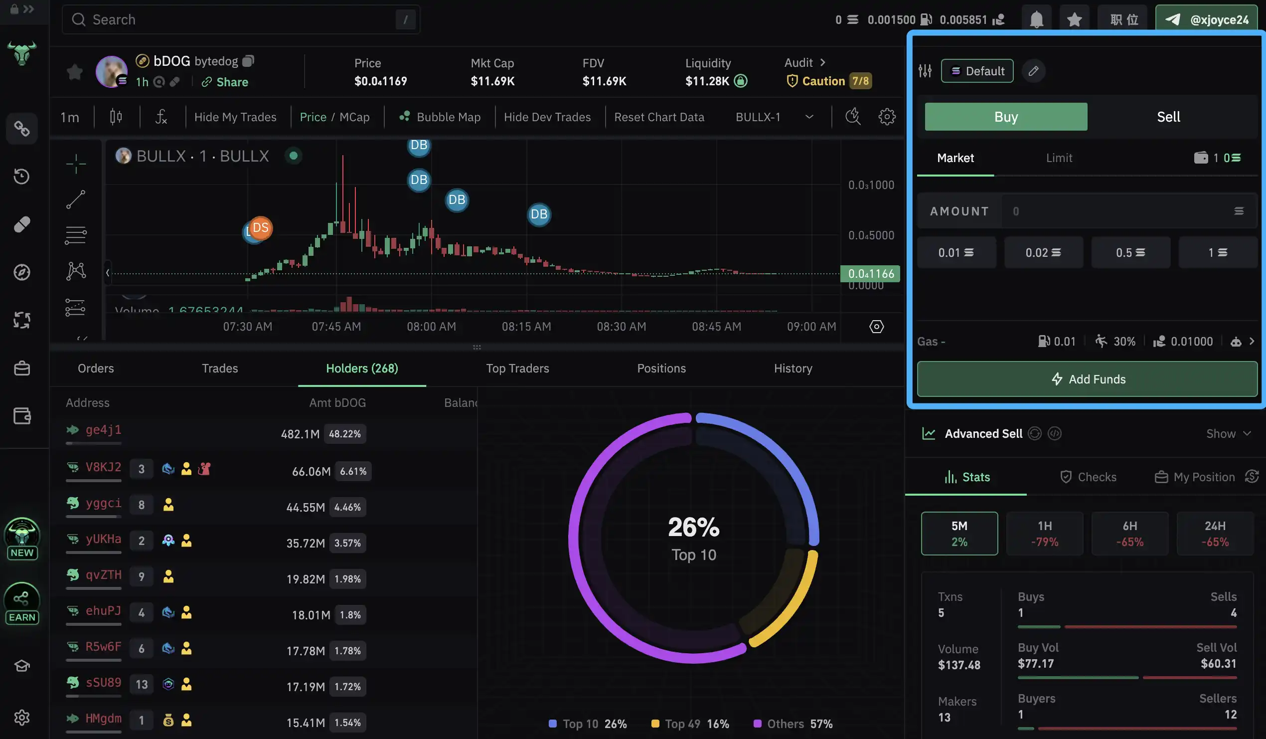 GMGN 在交易操作按钮附近显示了即时盈利情况,可以辅助用户根据盈利情况决定卖出的需求。而另一个工具能够提供多钱包同步操作、设定范围内随机金额交易等功能,适合有更多定制化交易需求的用户。Bullx 则可以让用户进行交易挂单,但考虑到 meme 交易对的流动性普遍不够深,对一些 meme 玩家来说,挂单功能的实际用处不大。