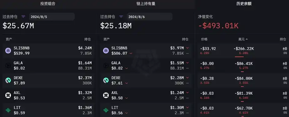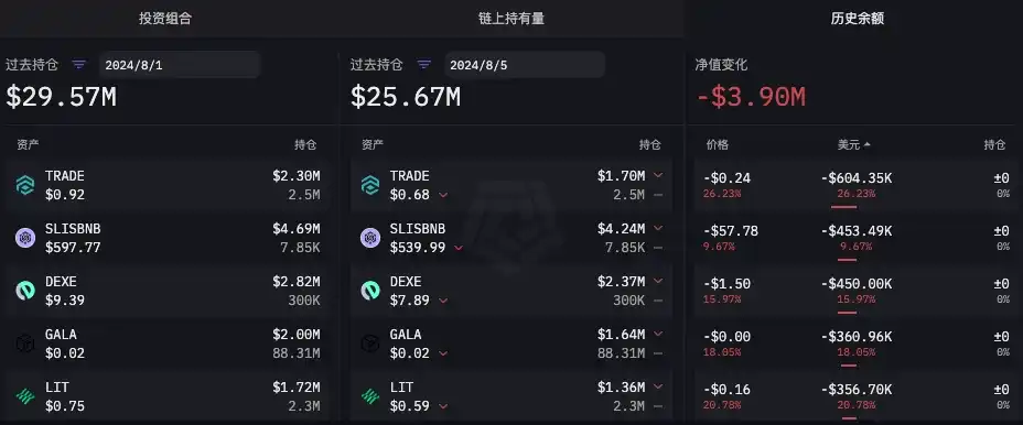 在「 85 」暴跌发生前,根据 ARKHAM 数据,DWF Labs 公开链上地址持仓多为山寨币,持有仓位最大的代币为 TRADE、GALA、DEXE 等。虽然资产净值被动贬值减少,但代币并未有明显流动,详细数据如下图所示。