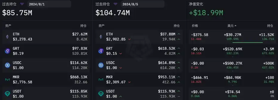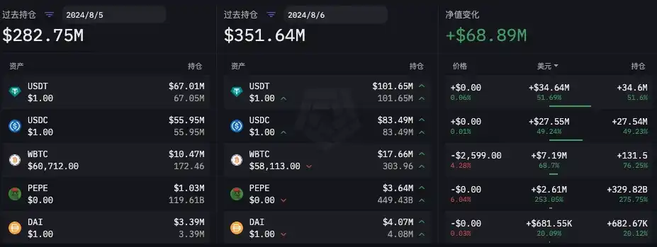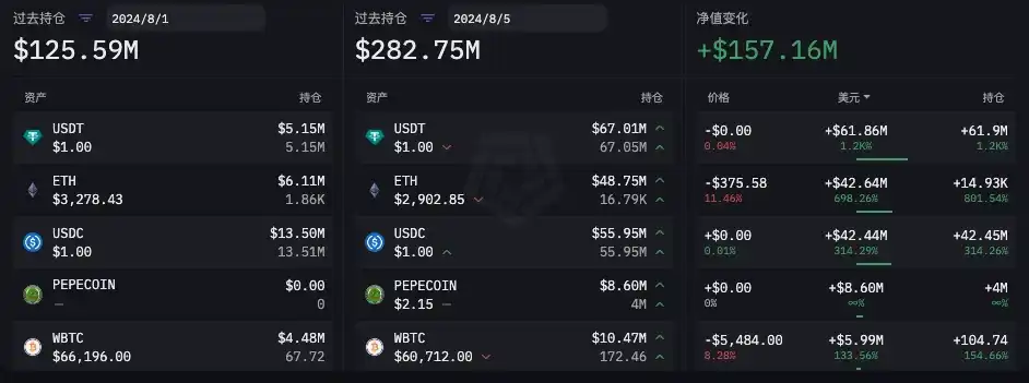 在「 85 」暴跌之前,根据 ARKHAM 数据,Wintermute 链上公开地址在 8 月 1 日至 8 月 5 日总持仓量净值在增长。主要变化为:稳定币 USDT 和 USDC 持仓增长超 1.04 亿枚,ETH 持仓增长超 1.493 万枚,WBTC 持仓增长 104.74 枚,同时还增持了 400 万枚 PEPE。详细数据如下图所示。