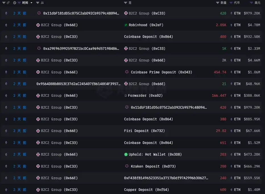 同时对 ETH 进行单独分析发现,B2C 2 Group 在 8 月 5 日至 8 月 6 日之间集中将大量 ETH 转入到了 Robinhood、Coinbase 及链上一些不明地址。