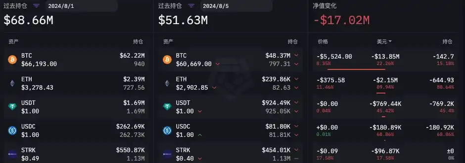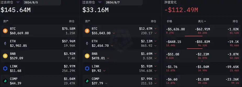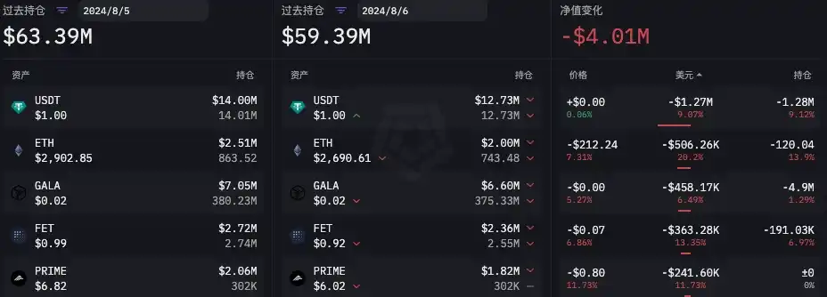 在「 85 」暴跌之前,根据 ARKHAM 数据,Flow Traders 链上公开地址在 8 月 1 日至 8 月 5 日总持仓量净值在减少。主要变化为:ETH 持仓减少 633.93 枚,BTC 持仓减少 142.69 枚,稳定币持仓减少变化并被明显。详细数据如下图所示。