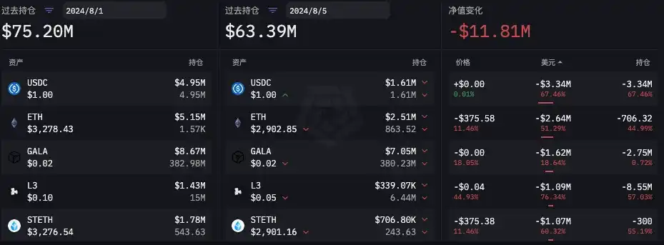 在「 85 」暴跌之前,根据 ARKHAM 数据,GSR Markets 链上公开地址在 8 月 1 日至 8 月 5 日总持仓量净值减少。主要变化为:ETH 持仓减少超 706 枚,STETH 持仓减少 300 枚,稳定币 USDC 持仓减少超 334 万枚,L3 持仓减少超 856 万枚。详细数据如下图所示。