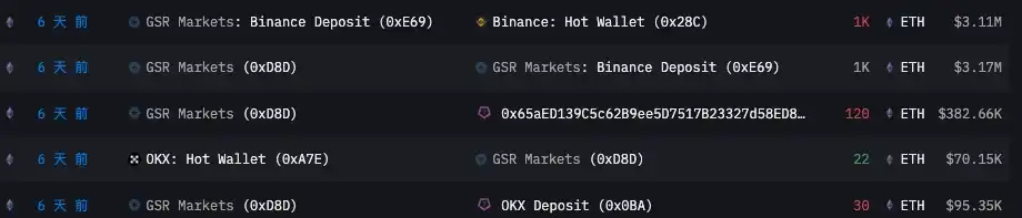 同时对 ETH 持仓进行单独分析发现,GSR Markets 在 8 月 1 日至 8 月 2 日之间将超 1000 枚 ETH 转入了币安等交易所。
