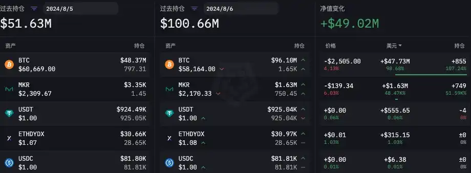 在「 85 」暴跌之前,根据 ARKHAM 数据,B2C 2 Group 链上公开地址在 8 月 1 日至 8 月 5 日总持仓量净值在增长。主要变化为:ETH 持仓增长 4650 枚,BTC 持仓增长 531.52 枚,同时还增持了 21.65 万枚 UNI、 2.3 万枚 COMP、 3.2 万枚 DAI。详细数据如下图所示。