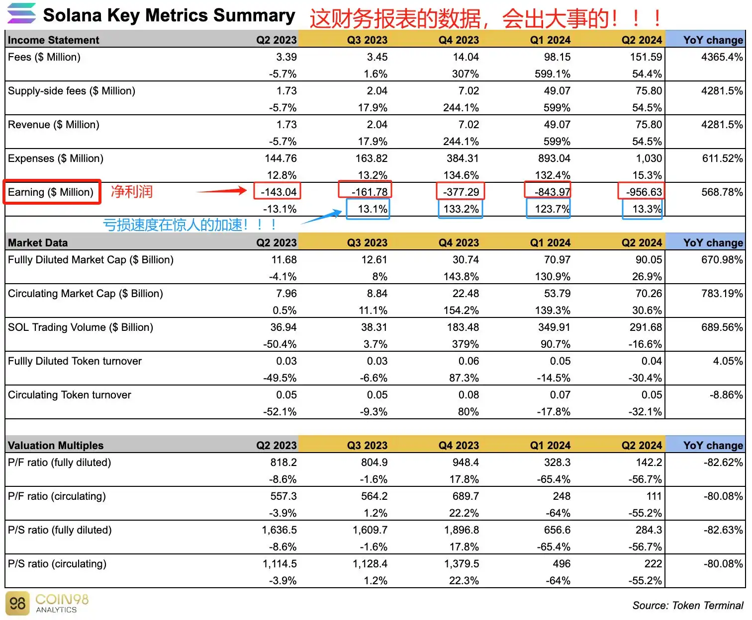 2 第二个原文作者提出的是 SOL 巨额亏损并且快速扩大。从财务报表中看到 23 年 Q2 开始亏 1.6 亿、亏 3.7 亿、亏 8.4 亿、到今年 Q2 的 9.5 亿。