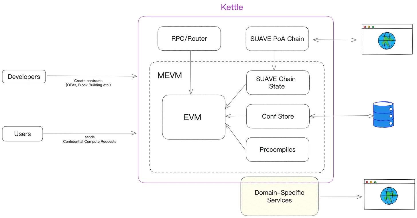 我们可以看到,开发者使用 solidity 语言开发、部署应用,最终请求到了 Kettle 之后,都是 MEVM 处理的,MEVM 里面除了有 geth 的功能,还在其上面增加了一些 precompile,可以存储,检索私密数据等。此外,它还处理(包括修改、检索)SUAVE 链上的状态。