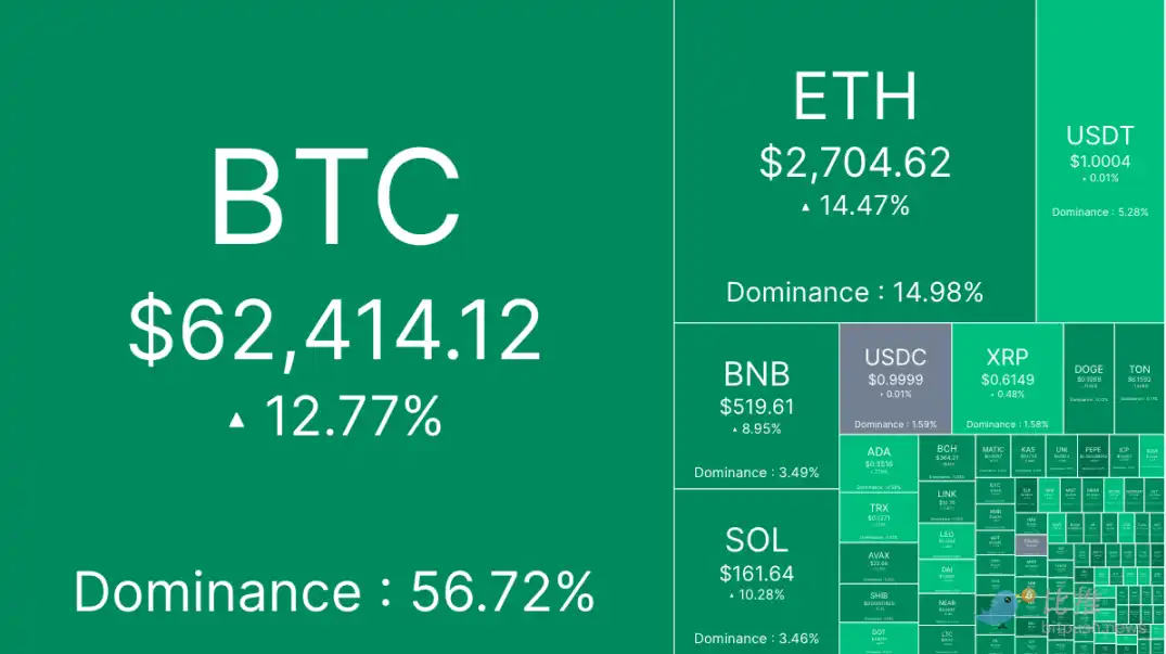 比推数据显示,比特币凌晨从 54, 700 美元附近的低点反弹,多头一路上攻至 59, 000 美元以上,尾盘陆续突破 60, 000 美元和 62, 000 美元的支撑位,截至发稿时,BTC 交易价格为 62, 414 美元, 24 小时涨幅接近 13% 。