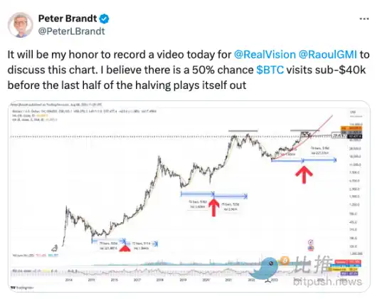 著名交易员 Peter Brandt 于 8 月 8 日发推文表示,他认为比特币在下次上涨之前跌破 40, 000 美元的可能性为 50% 。