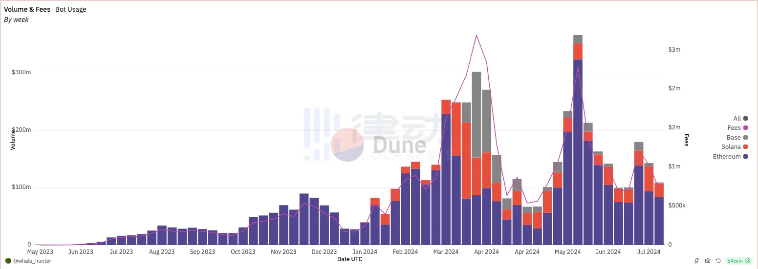 也正因为 meme 热潮越来越频繁,能够提供跟单交易、数据分析、资产跨链等功能的 TGBot 进一步打压了 DEX 市场。据Dune 数据,Banana Gun 交易量在 meme 热潮期间实现了 50 亿美元的交易量,目前交易量已超 56 亿美元,平均每日交易量超 2300 万美元。