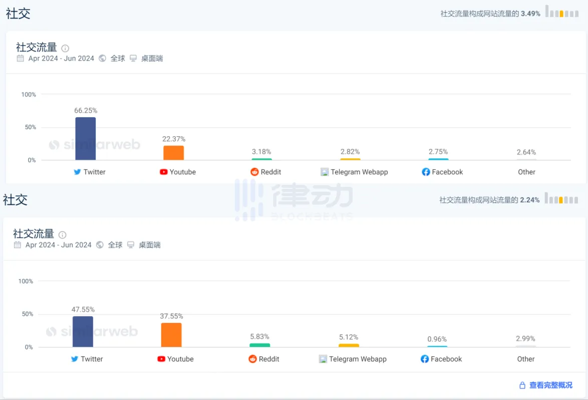 在精心运营维护下,Jupiter 打造出了一个繁荣热闹的社区。据similarweb数据,Jupiter 的所有社交流量中,Twitter 占了 66.25%。从整体上看,Jupiter 的社交流量占网站流量 3.49%,相比同样被称为 Solana 新龙头的 Raydium,Jupiter 更能将社交媒体传播影响力转化为流量,且主要依靠 Twitter 传播。这也从侧面说明,Jupiter 与社区的互动联系更为紧密。