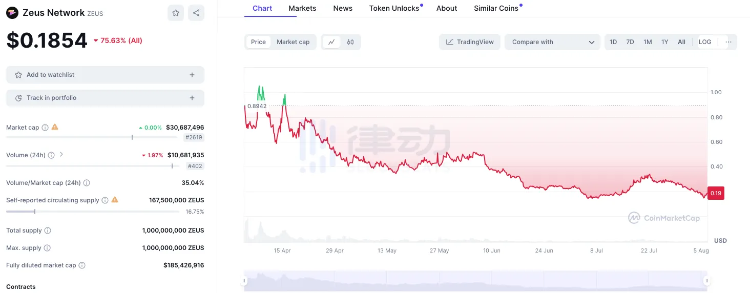 一期优胜项目 Zeus Network 于 4 月 4 日在 Jupiter LFG Launchpad 正式上市,ZEUS 代币总量为 5000 万,最终以 0.776 美元的报价结束。随后 OKX 立即上线 ZEUS,交易量在开盘 20 分钟就突破 1 亿美元。然而好景不长,仅过一周,ZEUS 抵不住市场抛压,一路下砸至 0.185 美元,据开盘跌去 10 倍。