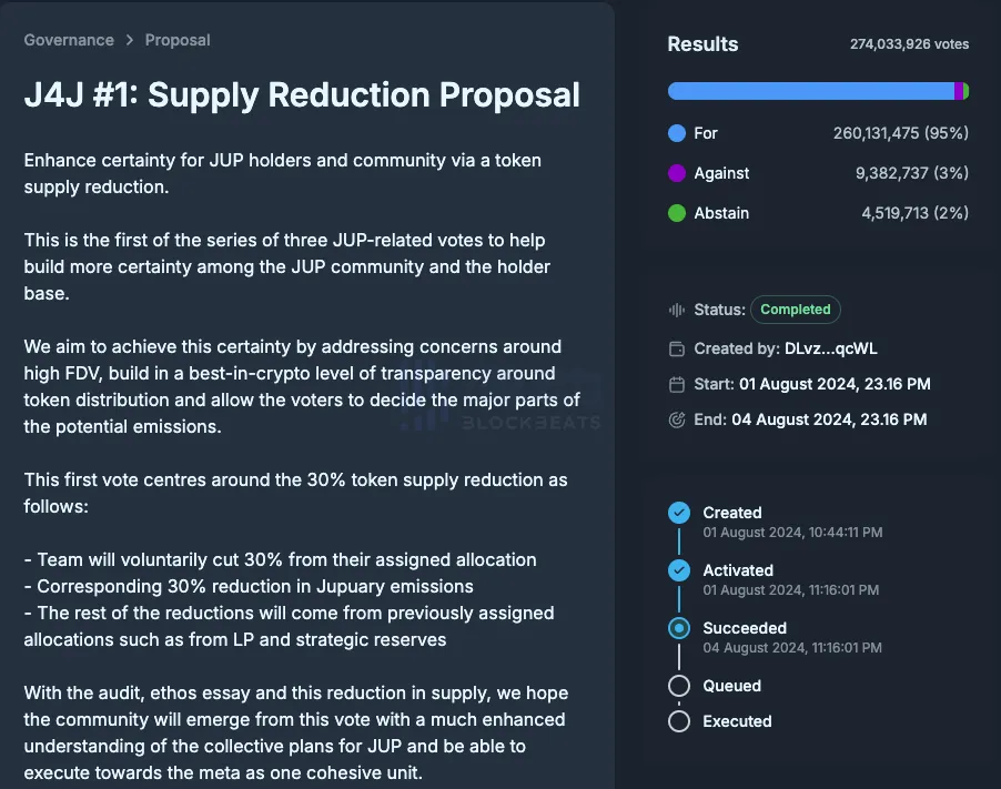 此外,为了进一步「贴近民心」,Jupiter 于 6 月中旬提出减少代币供应提案,且团队自愿从分配的代币中削减 30%,代币排放量相应减少 30%。其余的削减将来自之前分配的分配,例如有限合伙和战略储备。该提案于 8 月 1 日进行,仅半日就收集超 1.6 亿投票。最终以 95% 的人投票支持通过,并获得 2.74 亿票,创 DAO 投票率记录。