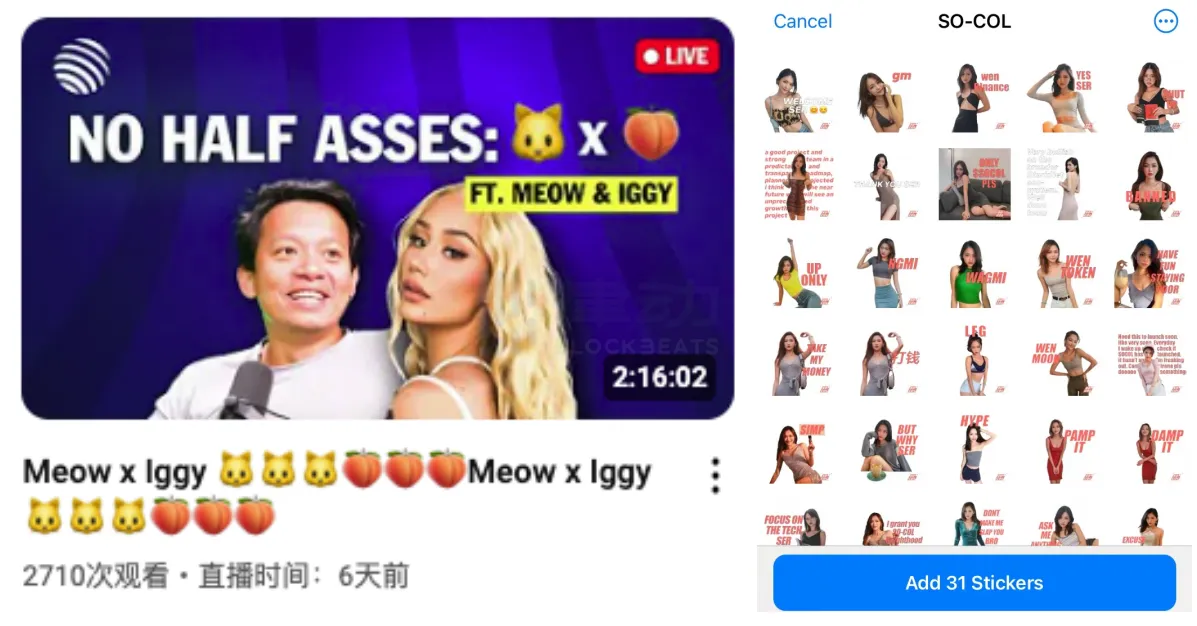 左图为 meow 与 Iggy 的 YouTube 直播,右图为 Telegram 上的 IreneDAO 表情包