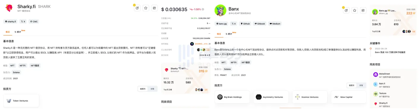 而与他们的同期项目,排名靠前的 NFT 借贷协议 Sharky.fi 和 NFT 流动性协议 Banx 也有融资背景,只是投资方及融资金额远不比 Zeus。其中 Sharky.fi 只有 Token Ventures 投资,且融资金额和融资日期未知,Banx 在 2022 年完成 100 万美元种子轮融资,而 DePIN 基础设施 Uprock、清洁能源网络 Srcful 和 MonkeyDEX 并没有相关融资纪录。