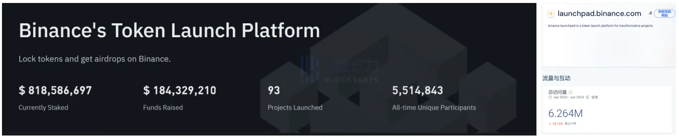 若以链下平台对比,最活跃的 Binance Launchpad 目前已启动了 93 个项目,累计唯一参与者超 550 万人,推出项目数和唯一地址数均为 Jupiter 的 10 倍。在过去三个月内,Binance 共推出 6 个项目,其 Launchpad 网站访问量达 626 万,而 LFG 在推出 3 个项目的背景下,访问量甚至略超 Binance 的一半。