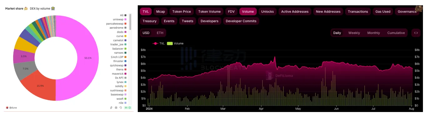 左图为 DEX 交易量市占比,右图为 Uniswap 在 2024 年的 TVL 和交易量变化