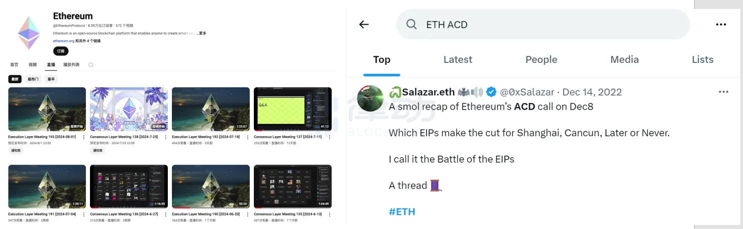 左图为以太坊 YouTube 直播栏目,右图为以「ETH」「ACD」为关键词的 Twitter 搜索结果