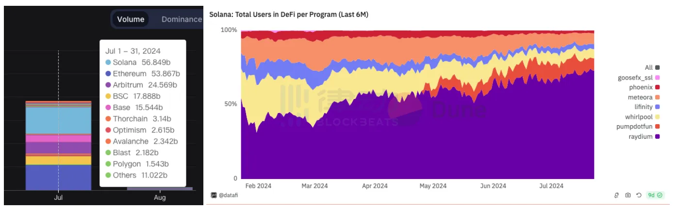 左图为公链按 DEX 交易量排名,右图为 Solana 上不同 DeFi 协议用户总量