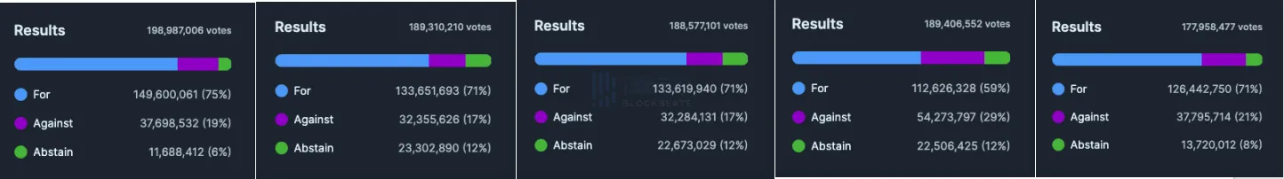 在社区提案上,DAO 成员可以决定 Jupiter 将各工作组代币分配。其中 Uplink 工作组预算的投票数最少,约 1.78 亿。但即使以目前的 JUP 质押数看,4 个月前的投票率仍超 50%。此外,大部分提案通过票占比超 70%,弃权票均维持在 15% 以下。