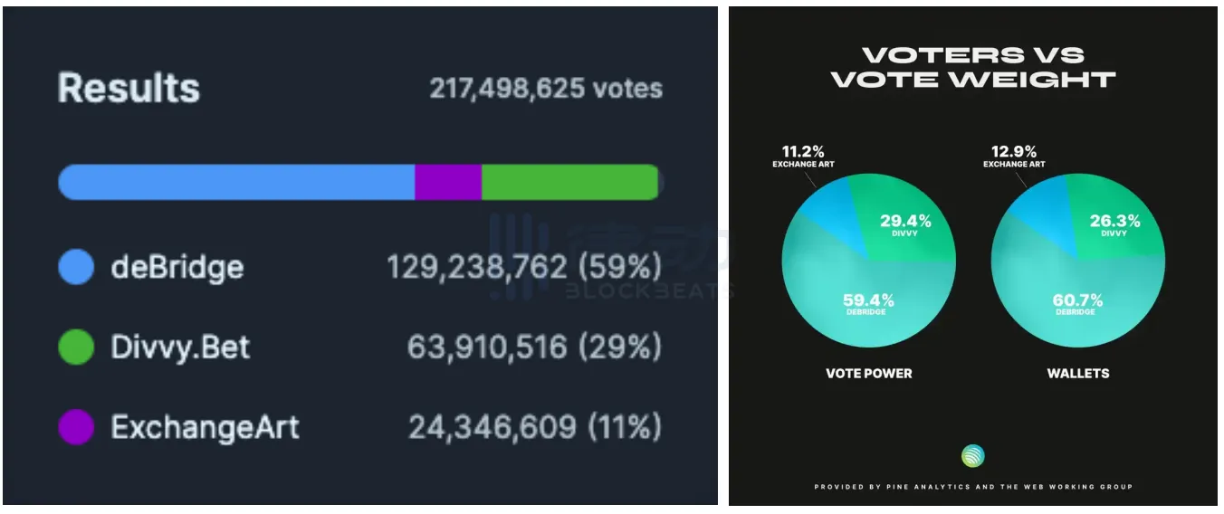 此外,由于 Jupiter 注重公平,刻意淡化了投票的贿选因素,所有质押 JUP(至少 50 枚)的用户都可以参与投票,一个钱包只能选一个项目,1 枚 JUP 代表一投票权。对此,风无向表示「这让投票成了一种形式」。