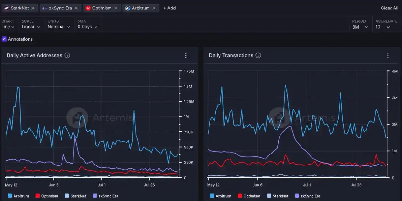 根据 Artemis 数据,相比于 Arbitrum、Optimism、zkSync 等多个 Layer2,Starknet 目前的日活跃用户和日交易数量、以及 DEX 日内交易量,每日捕获的交易费用都排在倒数第一。且在众多 Layer2 产生正向利润的情况下,Starknet 仍未盈利。
