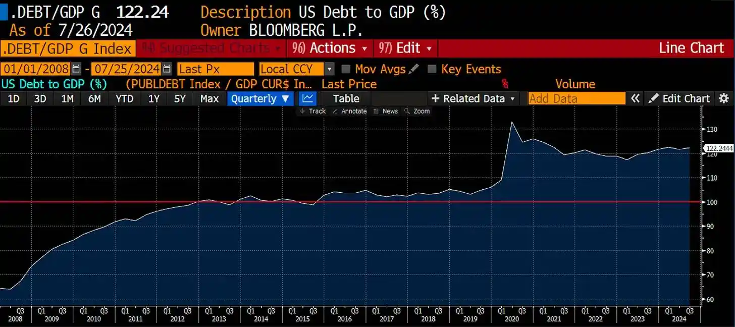 COVID 的爆发以及美国政府让人们居家隔离的措施,并通过发放刺激支票来换取他们的服从,导致债务与 GDP 的比率迅速超过 100%。从「奶奶」转变为「坏女孩」耶伦只是时间的事。
