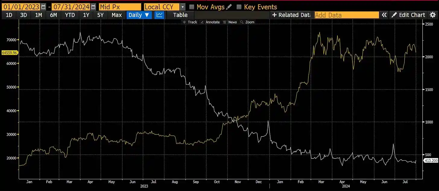 这张比特币(黄金)与 RRP(白色)的图表清晰地展示,从一月到四月,当国库券净发行时,RRP 下降,比特币上涨。从四月到七月,当国库券从市场中净撤回时,RRP 上升,比特币横盘交易,伴随着几次剧烈的下跌。我在七月一日停止,因为我想展示美元-日元从 162 强劲回落至 142 之前的互动,这导致风险资产普遍抛售。