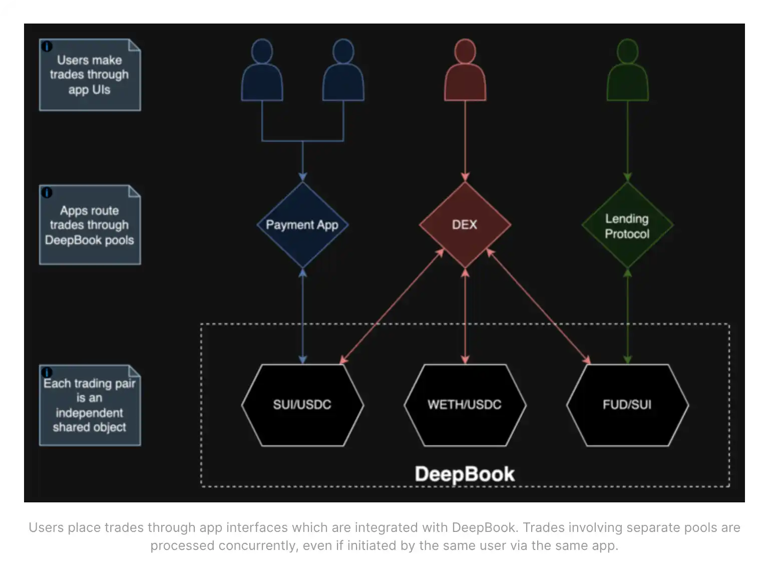 DeepBook 是一个开源的中央限价订单簿(CLOB),作为 Sui 生态系统内的共享流动性层。通过为 DeFi 提供可靠的交易基础设施,DeepBook 让开发者可以专注于构建新功能,而无需管理基础的交易逻辑或启动自己的流动性池。借助 DeepBook,每种资产都有其独立的流动性池,防止交易对之间的干扰,确保交易处理更顺畅、更快速。