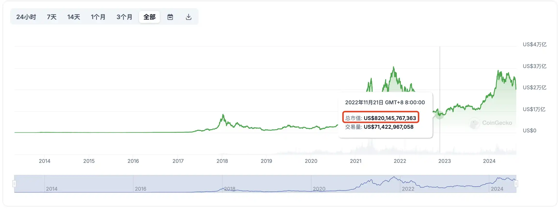 据 Coingecko 数据显示,2022 年 11 月,受 FTX 暴雷等事件影响,比特币价格一度跌破 16000 美元,低至 15800 美元左右;以太坊价格一度跌破 1100 美元,低至 1090 美元左右;加密货币市值一度跌破 1 万亿美元,低至 8200 亿美元左右。