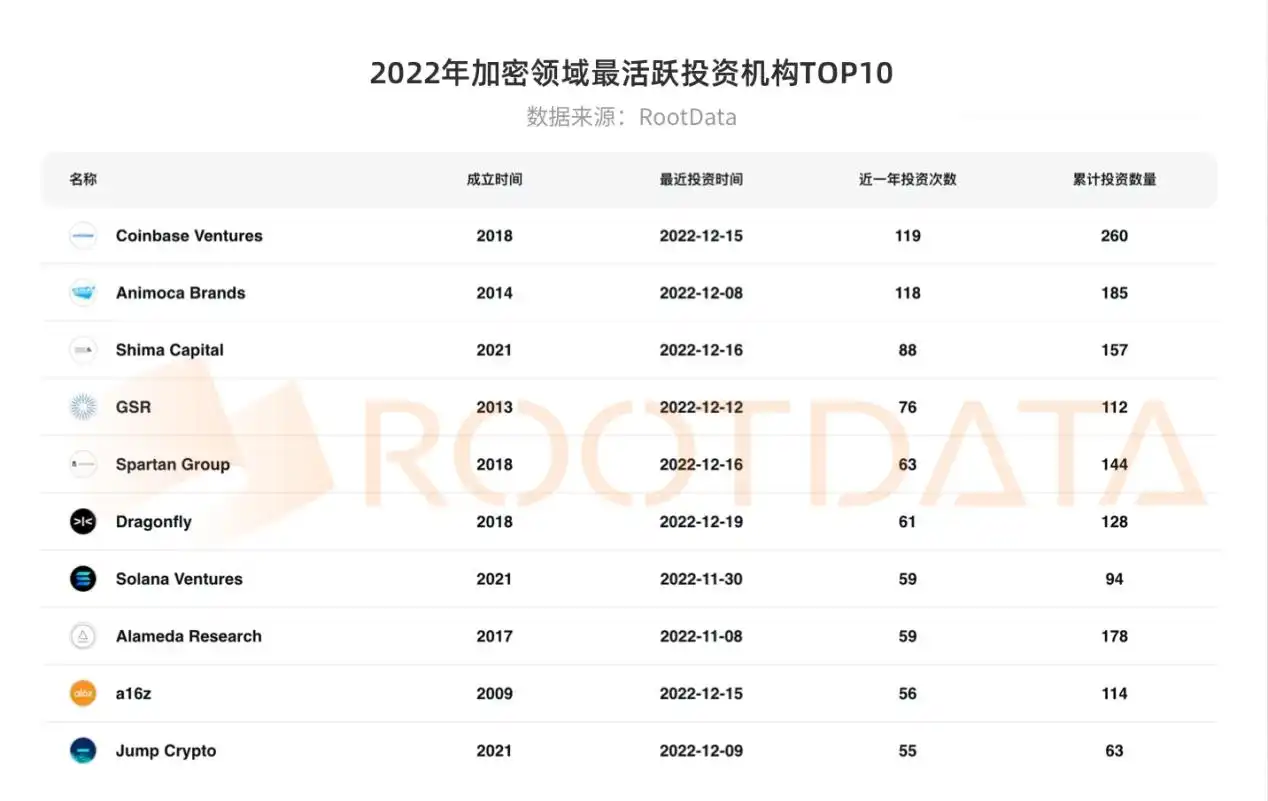 2022 年,以投资笔数评估的机构活跃度来看,排名前十的投资机构分别是 Coinbase Ventures、Animoca Brands、Shima Capital、GSR、Spartan Group、Dragonfly、Solana Ventures、Alameda Research、a16z、Jump Crypto。
