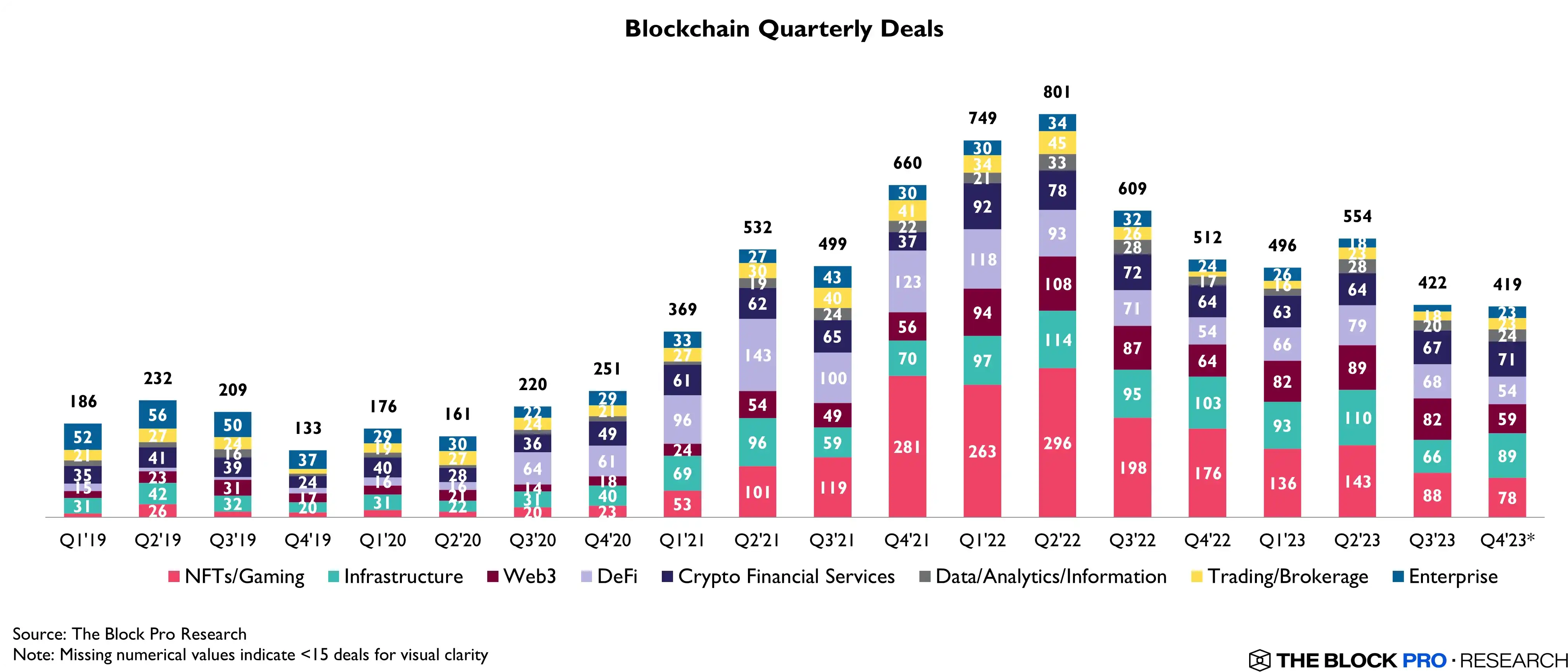 · Infra 赛道投融资事件共 426 起,融资总规模为 125 亿美元,规模在 1 亿美元及以上的有 35 起,规模最大的是 Luna Foundation Guard(LFG)通过场外销售 LUNA 完成的 10 亿美元融资,由 Jump Crypto 和三箭资本(简称 3AC)领投。