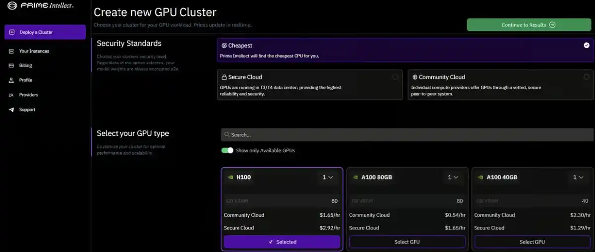 从顶级 H100 到 RTX3000 和 4000 系列,他们提供多种 GPU 选择。目前集群规模上限为 8 个 GPU,Prime Intellect 正努力将其扩大到 16-128 个。