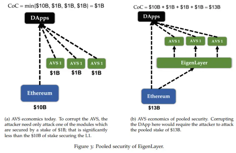 尽管再质押支持池化安全,但存在运营商勾结的风险。例如,如果一个价值 200 万美元的网络由价值 1000 万美元的再质押 ETH 保护,那么攻击该网络在经济上是不可行的,因为攻击成本(500 万美元)高于回报(200 万美元)。但是,如果同样的 1000 万美元再质押 ETH 还保护另外 10 个价值 200 万美元的网络,那么攻击在经济上是可行的。为了缓解这种情况,可以对过度致力于其他服务的验证者的再质押资产施加限制,以防止再质押 ETH 过度集中。