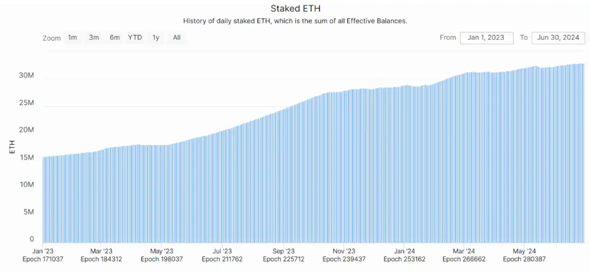 截至 2024 年 7 月 1 日,余额中质押的 ETH 接近 3300 万个,其中约 1340 万个 ETH(460 亿美元)通过流动质押平台质押,占所有质押 ETH 的 40.5%。由于 Eigenlayer 上的原生 ETH 存款增加,而 LST 存款上限有限,这一比例最近有所下降。