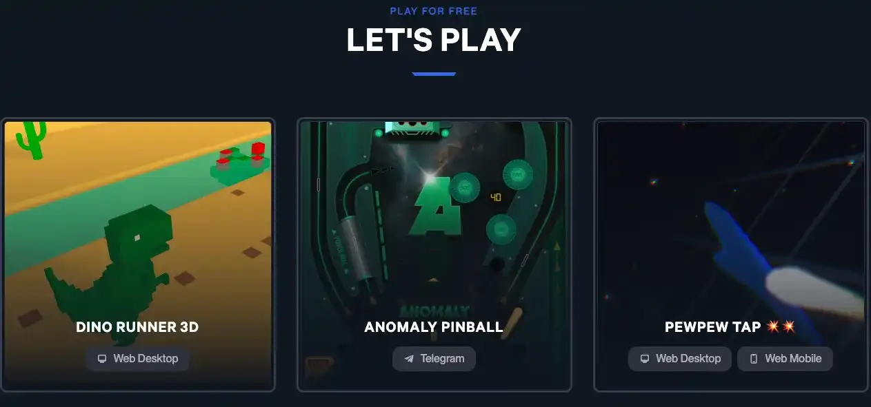 今天在 B3 上,你可以在 Web、移动设备、桌面和 Telegram 上玩流行的链上游戏,例如 Dino Runner 3D 、Anomaly Pinball 、PewPew Tap 等等!