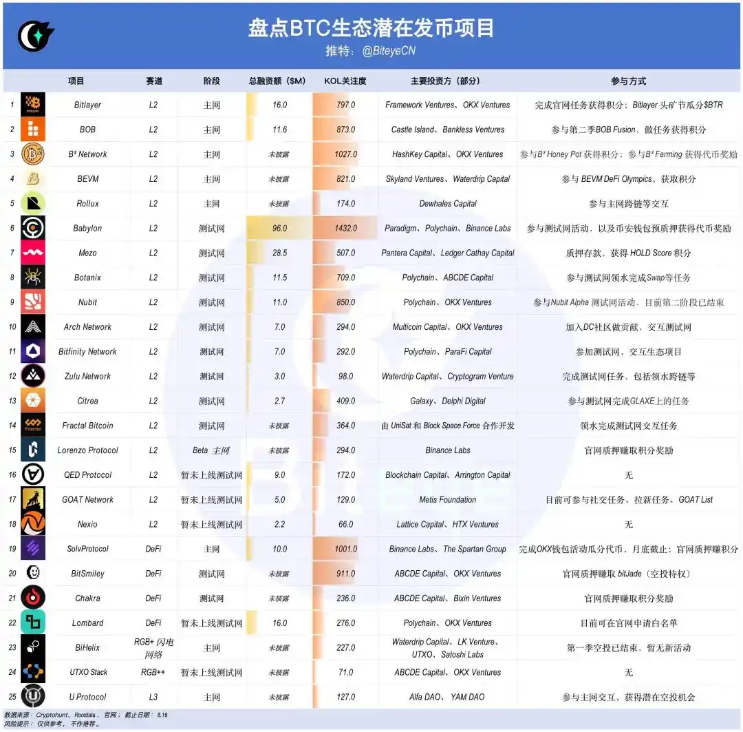 1、Bitlayer:总融资 1600 万美元,由 Framework Ventures、OKX Ventures 等投资。