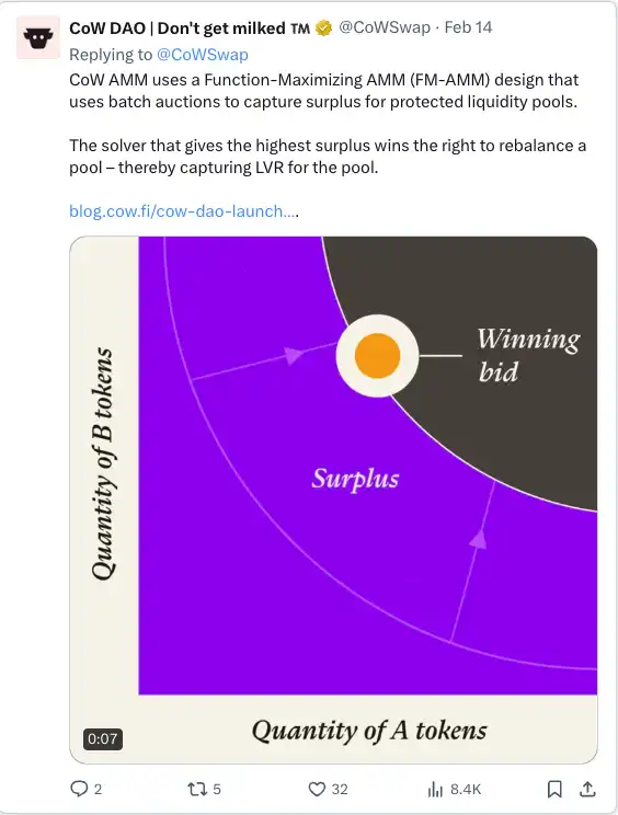 这种基于 Solver 干预的批量拍卖交易机制,使得 CoW Swap 专门防止外部交易者的价值被提取。在此机制基础上,CoW Swap 进一步推出了 CoW AMM,旨在不仅保护交易者的交易免受 MEV 的影响,还保护流动性提供者(LP)。CoW AMM 被提出作为一种捕获 MEV 的 AMM,旨在消除由于套利者导致的 LVR(再平衡损失)。