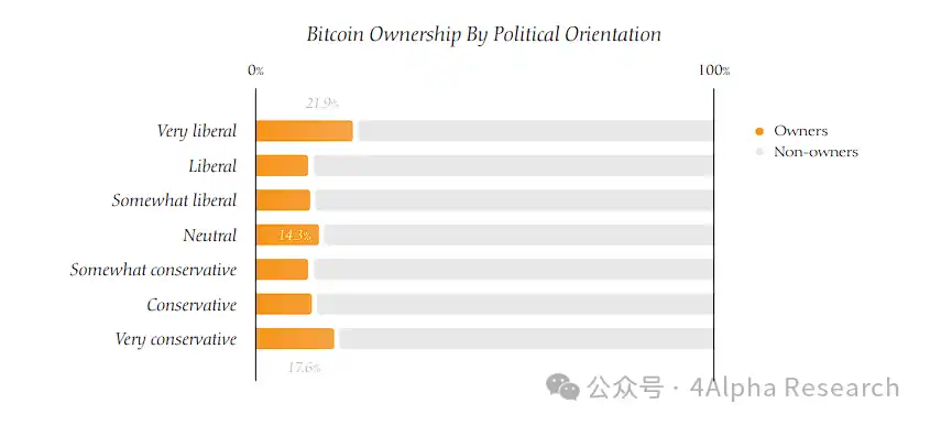 从政治角度看,比特币持有者与非持有者没有显著差异。尽管比特币自问世以来一直受到各政治派别的批评,近年来尤其受到政治左翼的攻击,而其最坚定的支持者往往是共和党人和自由意志主义者,这使得许多人误以为比特币是一种右翼或自由意志主义现象。结果是,许多人认为民主党人或自称自由派的人不太可能拥有比特币。