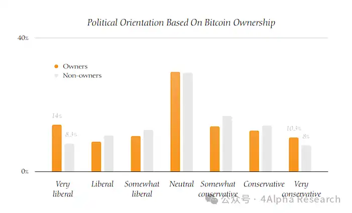 过去,人们常常认为比特币持有者的政治倾向影响了他们的选择,然而调查显示,比特币持有者的政治立场并没有明显的偏向。无论是自由派、保守派还是中间派,所有群体中都存在比特币持有者。唯一显著的人口统计差异在于比特币持有者更年轻且以男性为主。