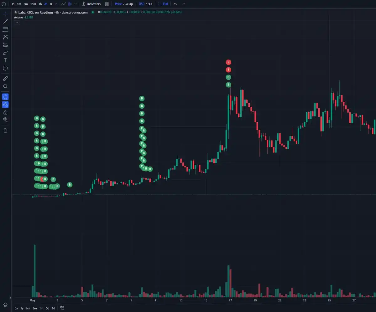 LABZ 的最大单笔销售发生在三天后的 5 月 19 日,当时代币的价格虽然已经过了峰值,但仍在高位。一位身份不明的鲸鱼抛售了价值超 7 万美元的代币,在代币发布当天购买 LABZ 后获利约 6.8 万美元。