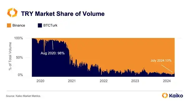 4、Binance 的市场主导地位:虽说 Gate.io、KuCoin 和 OKX 等其他几家交易所最近也进入了土耳其市场,但他们的市场份额低于 1%,而 Binance 与 BTCTurk 是土耳其交易者最常用的平台。尽管 BTCTurk 是最大的本地平台,但其市场份额从 2020 年的 95% 下降到 2024 年的 13%。Binance 由于其深厚的流动性和较低的交易费用,逐渐占据了市场主导地位。
