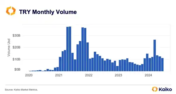 另外土耳其的加密货币市场在全球范围内越来越重要,已经成为第四大市场。根据 Chainalysis 的数据显示,土耳其的年加密货币交易量大约为 1700 亿美元,这个数字非常惊人,超过了许多传统上更知名的市场,比如俄罗斯和加拿大。Aiying 艾盈通过 kaiko 的报告给大家展示一下相关数据: