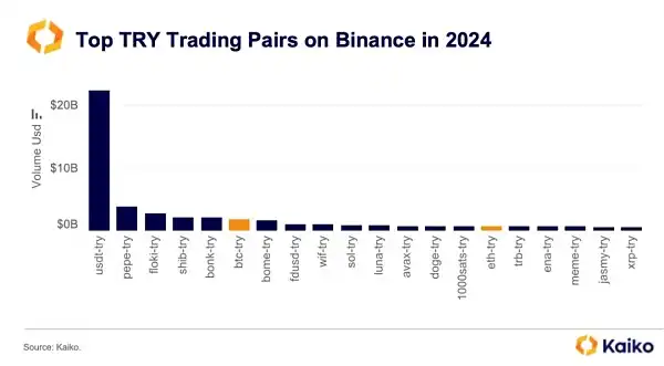 5、稳定币规模扩大:由于土耳其的通胀环境,稳定币的使用量大幅增加。2024 年,USDT-TRY 是 Binance 上交易量最大的交易对,超过了 220 亿美元。
