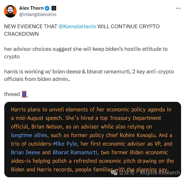 然而,这些变化是否足够?Galaxy Research 研究主管 Alex Thorn 在 X 上指出,由于哈里斯选择了拜登政府中两位反对加密货币的官员(Brian Deese 和 Bharat Ramamurti)参与她的团队,她可能会延续拜登的敌对政策。